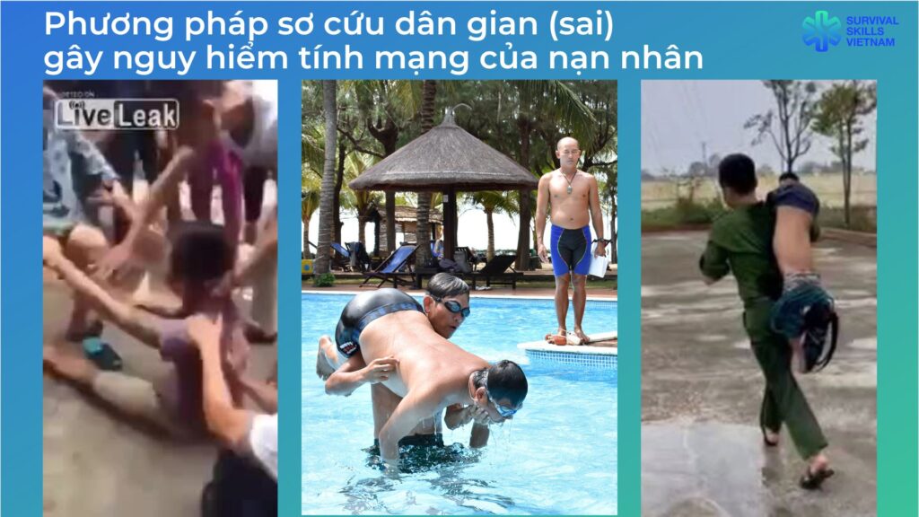 - Dốc ngược nạn nhân, vác lên vai rồi chạy: Đây là hình ảnh quen thuộc trong phim ảnh nhưng lại là một sai lầm nghiêm trọng trong thực tế. Hành động này lãng phí thời gian quý báu để thực hiện hồi sức tim phổi (CPR). Lượng nước trong phổi rất ít, việc dốc ngược không thể loại bỏ được nước, ngược lại còn có thể đẩy nước và dịch dạ dày trào ngược vào sâu trong phổi, gây viêm phổi hít, sặc và làm tắc nghẽn đường thở nghiêm trọng hơn.