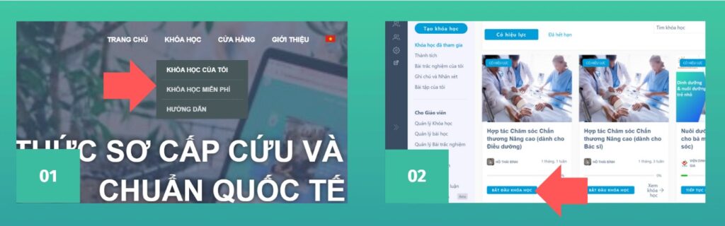 - Chọn mục Khóa học sau đó chọn Bắt đầu khóa học hoặc Tiếp tục khóa học
