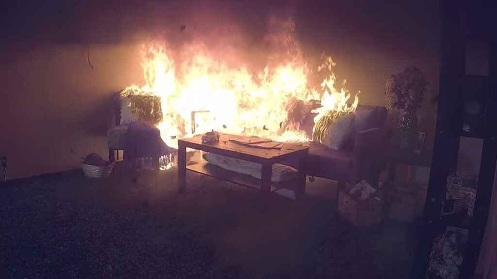 As firefighters stood by, a fire set to a sofa pillow in the modern room quickly spread across the sofa and jumped to other furniture: a lamp, an end table, a chair and coffee table. Within 3 minutes, flames were going through the roof.